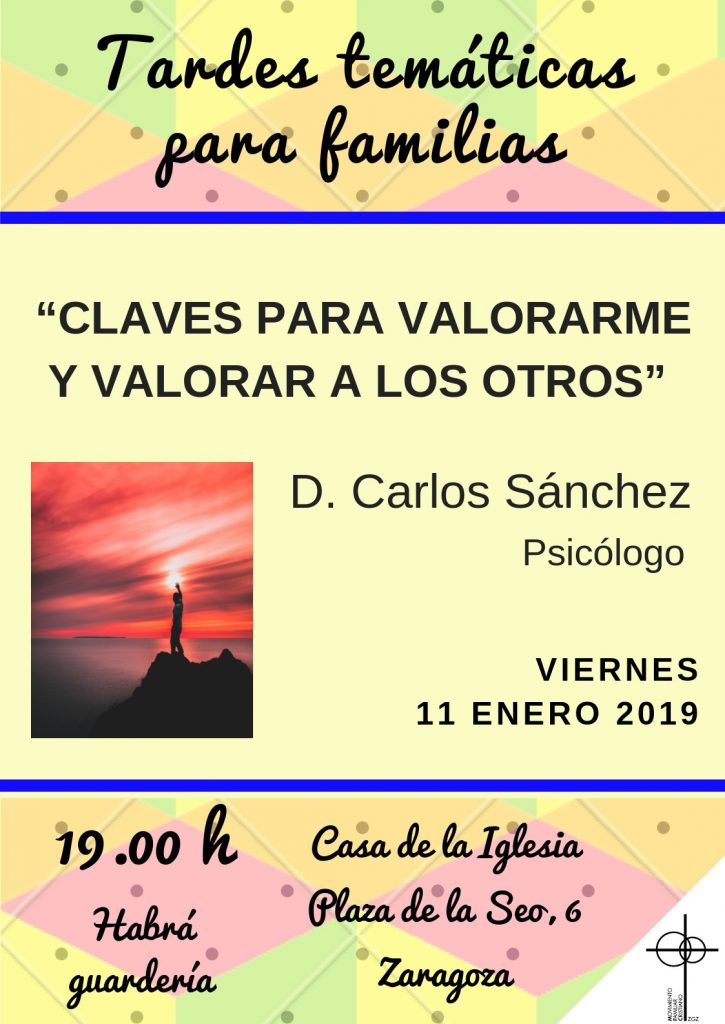 El pasado once de enero el psicólogo colaborador del COF, Carlos Sánchez, impartió una conferencia sobre las «Claves para valorarme y valorar a los otros». Esta sesión forma parte del ciclo de conferencias que organiza el Movimiento Familiar Cristiano de la diócesis de Zaragoza. Profunda y práctica sesión que contribuyó a mejorar nuestra formación y de los numerosos asistentes a la misma.